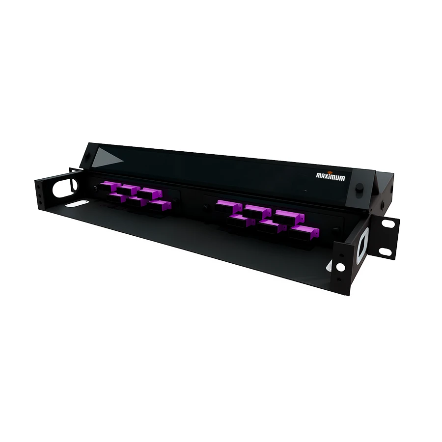 1U fiber patch panel preloaded with 24 OM4 SC or LC duplex adapters for rack-mounted distribution.