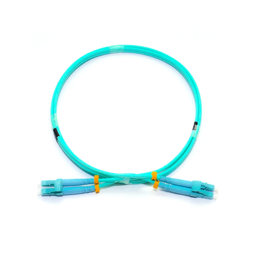 Duplex multimode patch cord with SC connectors on both ends for OM3 fiber links.