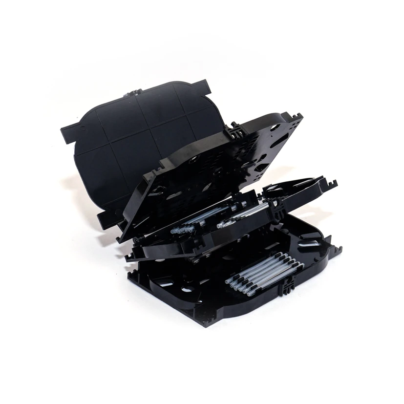 Fiber routing guides, Heat-shrink or mechanical splice holders, Stackable design for modular expansion.